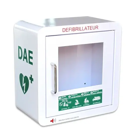 Compatible avec tous les modèles de défibrillateurs, il dispose d’une large fenêtre en plexiglas qui facilite la vérification visuelle du matériel. En outre, son installation est simple et il est équipé d'une alarme qui avertit immédiatement les personnes aux alentours en cas d'utilisation.